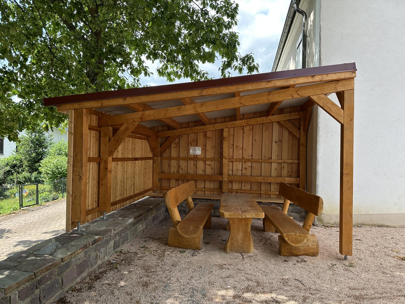 Im Rahmen der Neugestaltung wurde eine moderne Überdachung mit Pultdach errichtet, die Schutz vor Wind und Wetter bietet. Eine hochwertige Sitzgarnitur aus Vollholz lädt zum gemütlichen Beisammensein ein – sei es für eine kurze Rast, ein Gespräch mit Nachbarn oder zum stillen Erinnern.