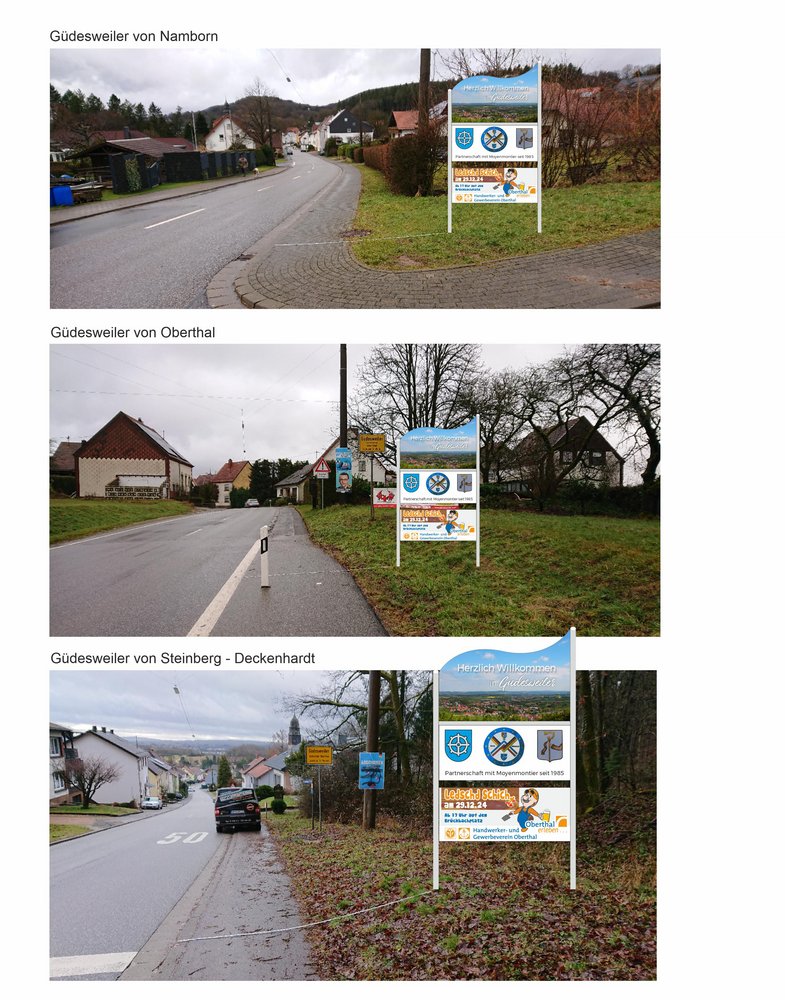 Als „Visitenkarten“ der Dörfer heißen diese Eingangsbereiche Besucherinnen und Besucher nun auf ansprechende Weise willkommen und bieten gleichzeitig einen schnellen Überblick. Die Tafeln sind klar strukturiert: Im oberen Bereich begrüßt ein freundlicher Willkommensgruß die Ankommenden. Darunter folgen der jeweilige Ortsname mit Wappen sowie das Logo der Gemeinde. Ein weiteres Element verweist auf die lebendige Partnerschaft mit der französischen Partnergemeinde Moyenmoutier.